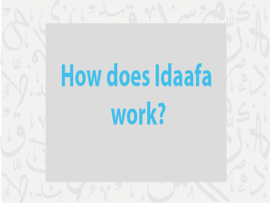 Notice that the word مكتب was translated to “the office”, even though it is indefinite. This is because second noun, which is already a definite noun with the definite article ال /al/, has taken ownership of the first noun, turning it into a definite noun. Idaafa is like an addition of one thing on another, where one noun is “of” another noun, hence “the office of the man.”