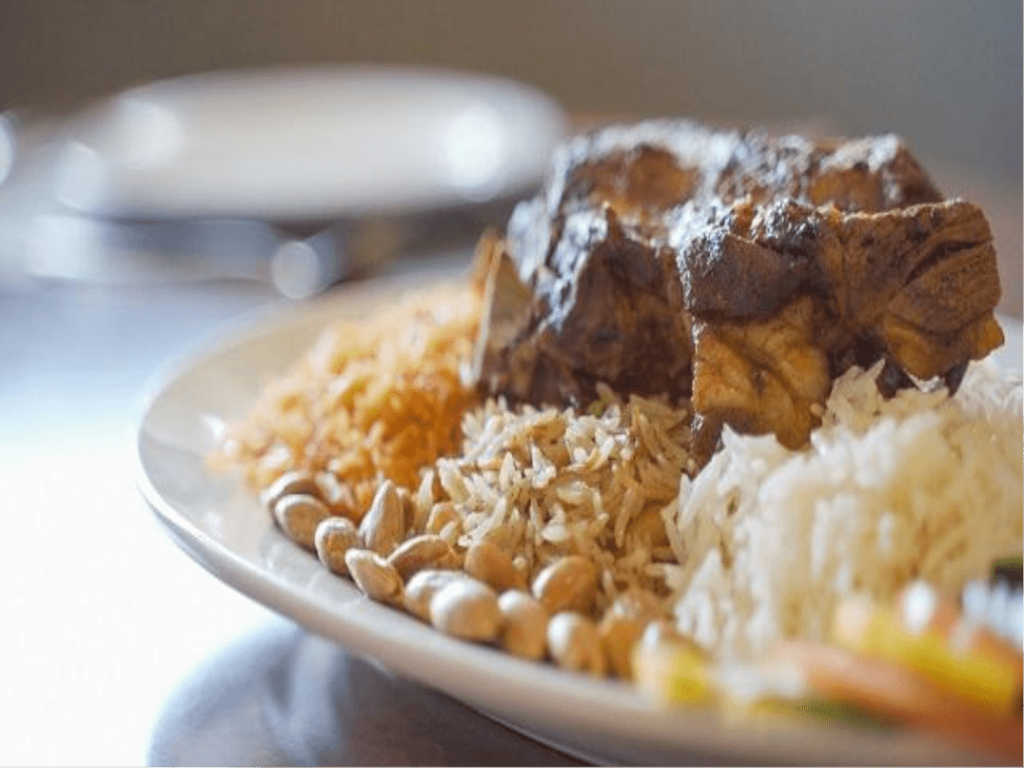 The Iraqi version of this traditional dish includes a savory, saffron-based rice with chicken. Variations might include vermicelli, fried onions, and fried potato cubes; however, no matter the version of biryani, almonds and raisins are always over the top of the rice. Sometimes, you will find maraq on the side, a sour and spicy tomato sauce. Additionally, you can usually count on Iraq biryani being on the menu for occasions like Eid, local wedding parties, and other Iraq festivals.